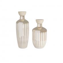 Inspired by vintage perfume decanters. Ribbed vessels of smoke luster-cut glass are topped with sculptural stoppers of grey marble and accented with nickel finished brass details. Set of two. Finish will vary.