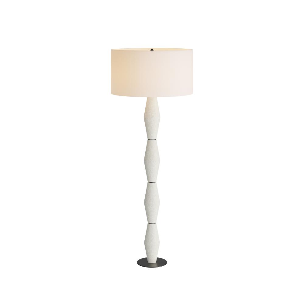 Inspired by iconic sculpture, this stacked totem of textured ricestone composite reinvents the modern floor lamp. Mounted on an English bronze circular base, its impactful shape brings dimensional intrigue to a space. Topped with a white linen drum shade with white cotton lining and an English bronze finial, it is finished with a taupe cloth cord and three-way rotary switch.