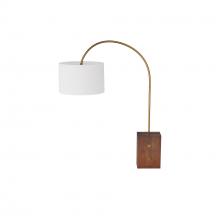 A whimsical mix of materials adds impact to the modern floor lamp. A substantial base of walnut finished rubberwood is punctuated with bolts of antique brass. From its arching brass arm, a drum-shaped shade of white linen perfectly diffuses the light, making the Bali a sophisticated choice for any space. Finished with a black cloth cord. Full-range dimmer.
