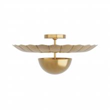 PLAYFULLY CONCEIVED TO RESEMBLE A LILY PAD, THE TERESA FLUSH MOUNT IS CAST ENTIRELY IN ANTIQUE BRASS WITH A DOMED BODY THAT EMITS LIGHT UPWARDS TO THE REFLECTOR, FORGED WITH SEAMS TO LOOK LIKE PETALS.