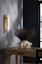 WITH A DISTINCTIVE DECO INFLUENCE, OUR VELASCO SCONCE IS UPDATED IN A MODERN, STREAMLINED DESIGN. THE WALL LIGHT IS CRAFTED IN A NARROW COLUMN OF LUXURIOUS WHITE ALABASTER AFFIXED TO A RECTANGULAR BACKPLATE OF ANTIQUE-BRASS IRON, WHICH GRIPS THE LED DIFFUSER ON EACH SIDE. FINISH WILL VARY. DAMP-RATED, ALTHOUGH LIMITED COVERED OUTDOOR CONDITIONS MAY AFFECT FINISH.