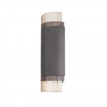 A LAYERED COMPOSITION OF TEXTURED CHAMPAGNE AND SMOKE GLASS CREATE THE MOODY AND MAGICAL VIVIAN SCONCE. INSPIRED BY JEWELRY, THE ARRANGEMENT FEATURES OVERLAPPING GLASS SLEEVES IN STAGGERED SIZES, WITH BRONZE IRON FORMING A CUFF AROUND THE GLASS COLUMN. DAMP-RATED, ALTHOUGH LIMITED COVERED OUTDOOR CONDITIONS MAY AFFECT FINISH.