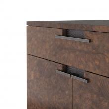 DECADENTLY WRAPPED IN TORTOISE BURL OAK VENEER, THE WHALEN SIDE TABLE DRESSES UP ANY SPACE. THE MULTI-FUNCTIONAL CABINET IS DESIGNED WITH DRAWERS AND BOOK-MATCHED DOORS, WHICH ARE ORNAMENTED WITH LINEAR HARDWARE AND DECORATIVE HATCHED GRILL INLAYS CLAD IN BRONZE BRASS. THE CABINET’S EBONY OAK VENEER INTERIOR IS FITTED WITH ONE ADJUSTABLE SHELF. FINISH WILL VARY.