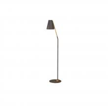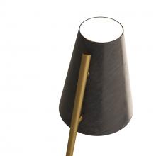 This masculine style offers a modern mix of materials and finishes. A slender vertical rod in English bronze and antique brass finish supports a conical shade of bronze. Mounted on a matching circular base with antique brass accents, it is finished with a taupe cloth cord. Full-range dimmer.