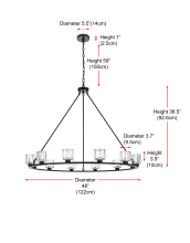 Add modern charm to your space with this striking chandelier, where a sleek circular iron frame meets sculpted clear glass shades. The unique design features decorative hanging rods with hooks, enhancing the structure with industrial flair. The clear glass refracts light beautifully, creating a radiant glow that uplights your space with warmth and dimension. Perfect for dining rooms, living rooms, or offices, this chandelier is available in black for a bold contrast, satin gold for a luxurious touch, and chrome for a sleek, modern vibe. With multiple size options and a matching canopy and chain for seamless installation, this dimmable chandelier offers both beauty and versatility. Light bulbs are not included, allowing you to choose the perfect style to match your vision.