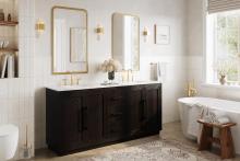This transitional bathroom vanity offers the perfect blend of timeless style and modern functionality. Available in five refined finishes—crisp white, sleek grey, chocolate oak, honey oak, and linen oak—it complements a range of decor styles, from classic to contemporary. The stunning herringbone design on the Shaker-style door panels adds texture and craftsmanship to the piece. Topped with a white engineered marble countertop featuring subtle veining, it provides both beauty and durability. The long black metal pulls on the soft-closing doors and the thin bar pulls on the drawers add sleek, modern detailing. Practical features include a concealed overflow, a back panel cutout for easy plumbing installation, and a U-shaped cutout shelf to fit plumbing while maximizing storage space. with a toe kick all around the base, this vanity is thoughtfully designed to blend form and function in any bathroom setting.