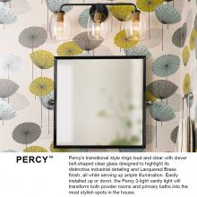 Percy’s transitional style rings loud and clear with clever bell-shaped clear glass designed to highlight its distinctive industrial detailing, all while serving up ample illumination. Easily installed up or down, Percy transforms any bathroom into one of the most stylish spots in the house. A collection of 3 versatile finish options, Antique Nickel, Black and Lacquered Brass, lets you pick the perfect Percy for powder rooms and primary baths alike.
