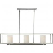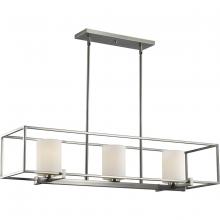 Beautiful opal glass shades visually calm the sharp edges of the boxy frame in a masterful stroke of design excellence.;The frame is coated in a classic brushed nickel finish that contrasts the light shades.;The light fixture is just right for spaces in ne